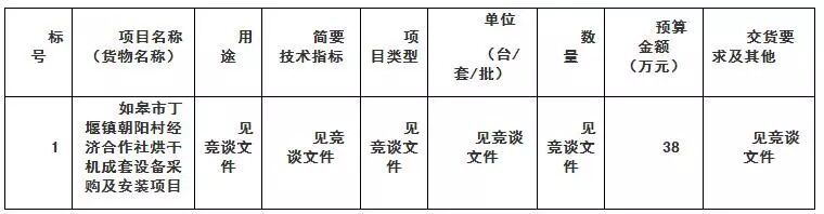 如皋市公共资源交易中心受如皋市丁堰镇的委托,对如皋市丁堰镇朝阳村经济合作社烘干机成套设备采购及安装项目进行竞争性谈判采购,现邀请符合资格条件的供应商参与竞谈。